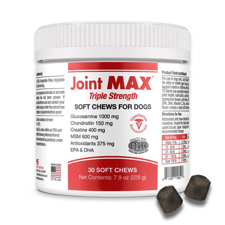 Joint MAX® Triple Strength Soft Chews is recommended for joint health with powerful active ingredients that enhance the functions of joint and connective tissue as well as antioxidants to help reduce oxidative stress. The Joint Max TS proprietary blend was selected to target every aspect of joint health: lubrication, cushioning of tissues, and support of cartilage, connective tissues, and bones.