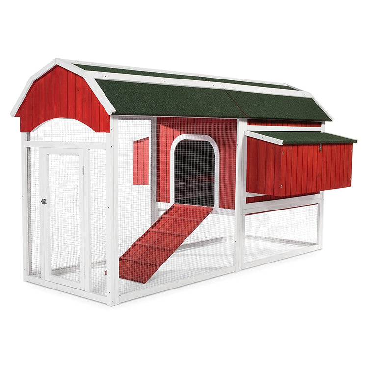 Prevue Pet Products large Red barn chicken coop 467 - inspired by the traditional Red barn found on many farms, our large chicken coop offers lots of living space while remaining compact enough to fit in an urban farm environment. Our thoroughly constructed design combines safety and security for your hens with modern and convenient features for you. There's plenty of room to roam in the protected chicken run while still allowing your flock access to the grass, ground and outdoors. Leave the front access door open for come & go activity or secure with the attached bolt-lock to protect from predators. A ventilated roosting area provides air circulation and light and includes three roosting bars plus an under-coop removable tray for interior cleaning. The large back-panel door gives you full entry to the roosting area and is secured with two bolt-lock closures. Adjacent to the roosting area, two nest boxes contains four nesting slots with each slot measuring approximately 9 ½” in width. Nest box lid lifts easily, or can be fully removed, for egg removal and can also be locked for additional security. Spacious enough for 8 – 10 hens, a traditional barn Red, non-toxic, stain is complimented by a green asphalt roof to keep the coop's interior cozy and dry. Heavy enough to prevent predators from lifting it, but easy enough for two people to Reposition. Prevue Pet Products large chicken coop 467 is easily assembled and includes step-by-step instructions. To maintain the longevity of your purchase, we recommend that you periodically treat it with a non-toxic sealant, and protect it with a tarp or other covering during extended periods of inclement weather. Coop measures 90 1/2'' long, 54''wide and 51 1/2'' high.