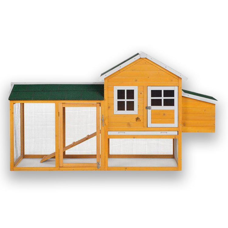 This adorable coop is compact yet roomy. The elevated coop allows hens full use of the enclosed chicken run. The coop interior features a removable floor tray for routine cleaning, two roosting bars, and full access to the 2-bay nest box. An interior coop divider door can be closed from the exterior with a jointed handle. Two access doors with barrel bolt locks and a lock-ready nest box lid allow access to all areas
